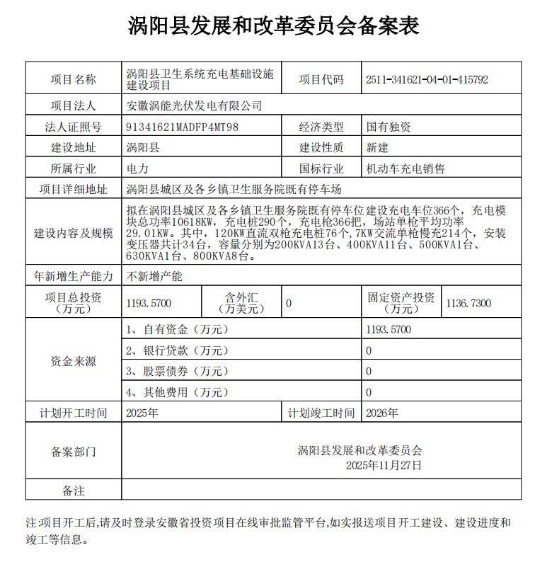 涡阳县发改委关于涡阳县卫生系统充电基础设施建设项目备案