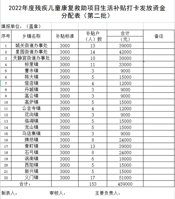 | 名称: | 2022年度涡阳县残疾儿童康复救助项目生活补贴打卡发放资金分配表(第二批) |