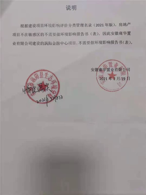 | 名称: | 涡阳金融中心项目不需要环评报告的情况说明 |