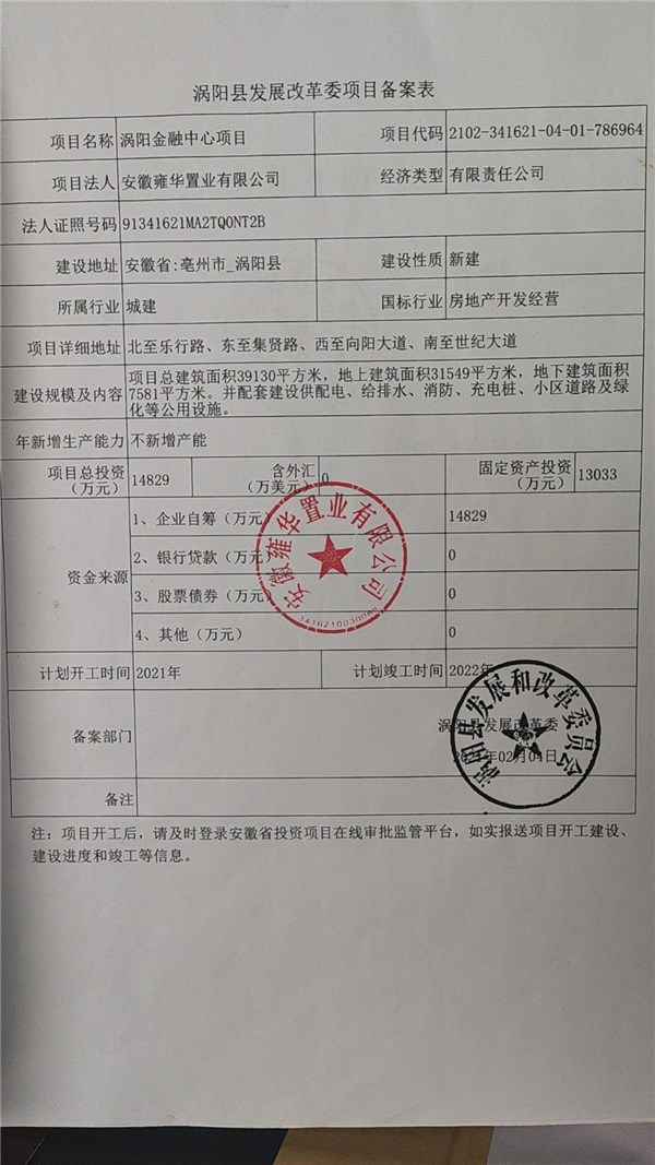 | 名称: | 涡阳县发展和改革委员会关于涡阳县金融中心建设项目备案 | 文号: | 无 |