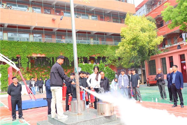 现场展示灭火器正确使用,邀请学生代表上台操作、演示。