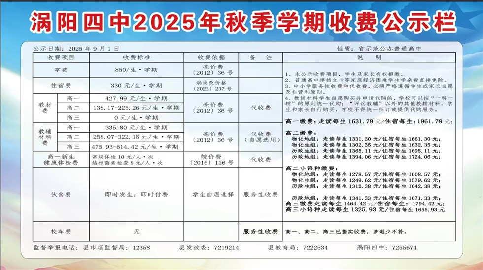| 名称: | 涡阳四中2025年秋季学期收费公示 | 文号: | 无 |