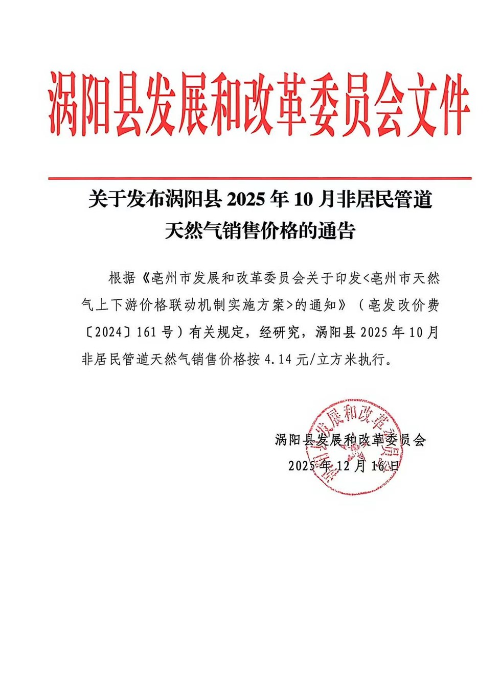 | 名称: | 关于涡阳海特燃气有限公司2025年10月非居民管道天然气销售价格的通告 |