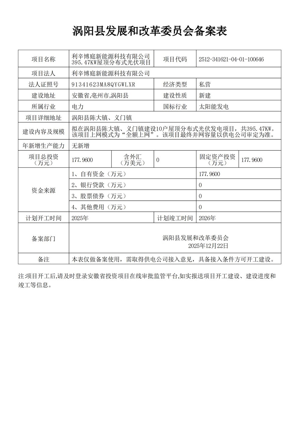 | 名称: | 涡阳县发改委关于利辛博庭新能源科技有限公司395.47KW屋顶分布式光伏项目备案 | 文号: | 无 |