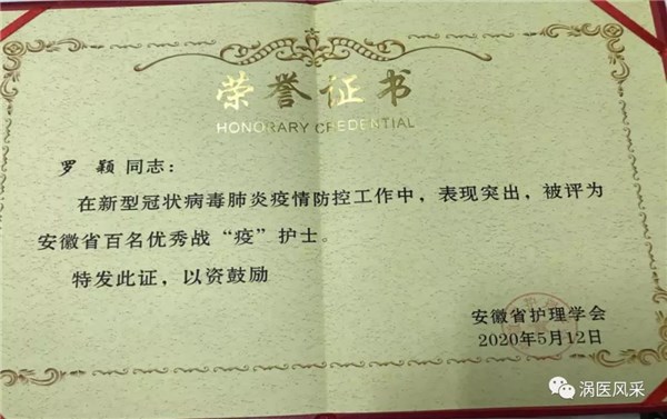 获得荣誉:自工作以来获得过安徽省“优秀护士”、市级“十佳先进工作者”、多次获县级、院级“十佳先进工作者”,优秀共产党员,党员示范岗,2020年在新冠肺炎防控工作中,被安徽省护理学会评为《安徽省百名优秀战“疫”护士》。