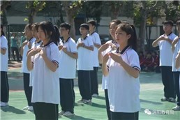 五星红旗升起,全体师生共同唱响国歌。