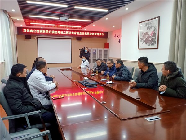 2021年12月29日上午,安徽省立医院帮扶专家一行七人:消化内科陈思、心内科张锡栋、肝胆外科甘磊磊、肿瘤放疗科雕丽琼、麻醉科居福宏、病理科彭燕、影像中心刘畅,在院党委委员、工会主席韩敏的带领下深入石弓卫生院,开展义诊帮扶进基层志愿服务活动。