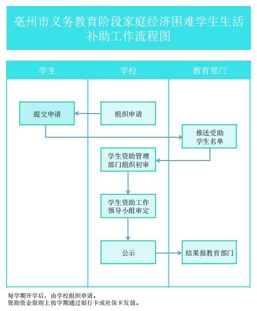 【转载上级】亳州市义务教育阶段家庭经济困难学生生活补助工作流程图