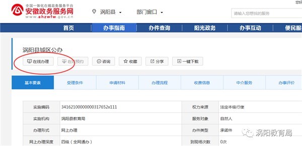 第二步:选择“安徽省政务服务网亳州分厅—涡阳县厅—部门窗口—县教育局”,选择对应的政务服务事项,点击“在线办理”。