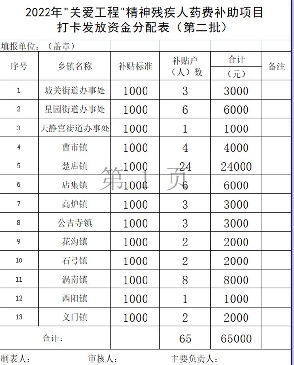 2022年涡阳县"关爱工程"精神残疾人药费补助项目打卡发放资金分配表(第二批)