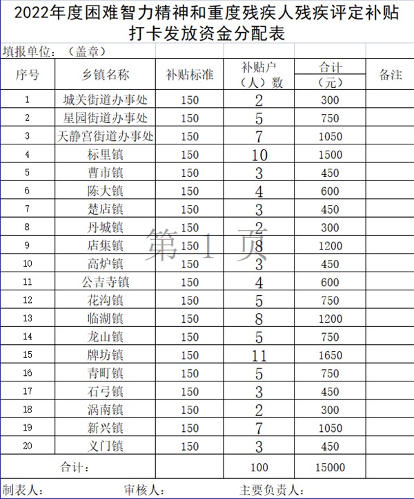 2022年度涡阳县困难智力精神和重度残疾人残疾评定补贴打卡发放资金分配表