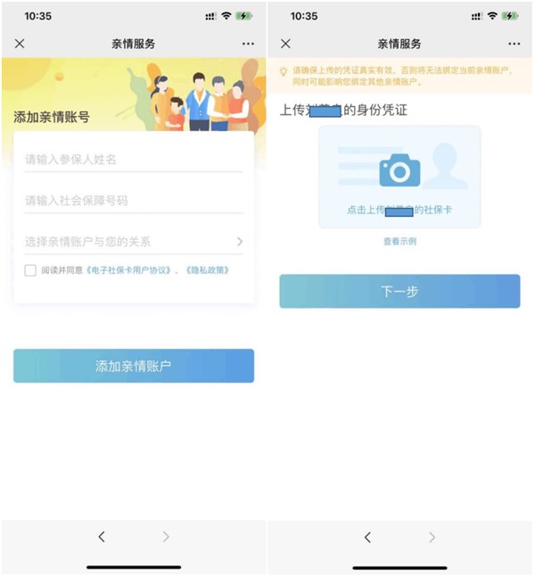3. 添加要开通的人的姓名、社会保障号码、亲情关系后,点击“添加亲情账户”并上传身份凭证(小于16岁需同时上传人脸正面照)。