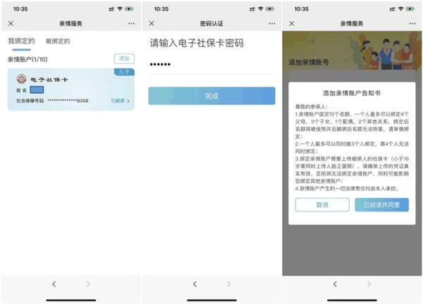 2. 点击“添加”-验证电子社保卡密码后,阅读添加亲情账户告知书。