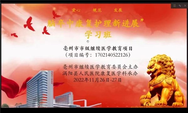 11月26日,2022年市级继续医学教育项目“脑卒中护理新进展”以腾讯云形式在涡阳县人民医院康复医学科示教室召开,本次会议由亳州市继续教育委员会主办,涡阳县人民医院康复医学科承办。开幕式由康复医学科护士长李芳主持,副院长张艳环在开幕式致辞。