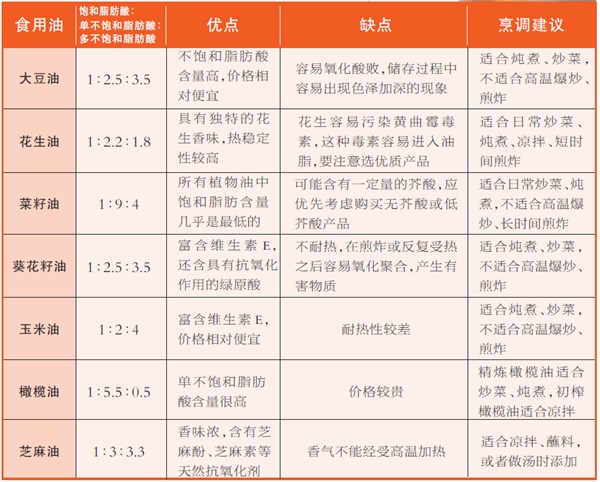 一张图表,为你梳理7种常见食用油的优缺点和烹调建议️: