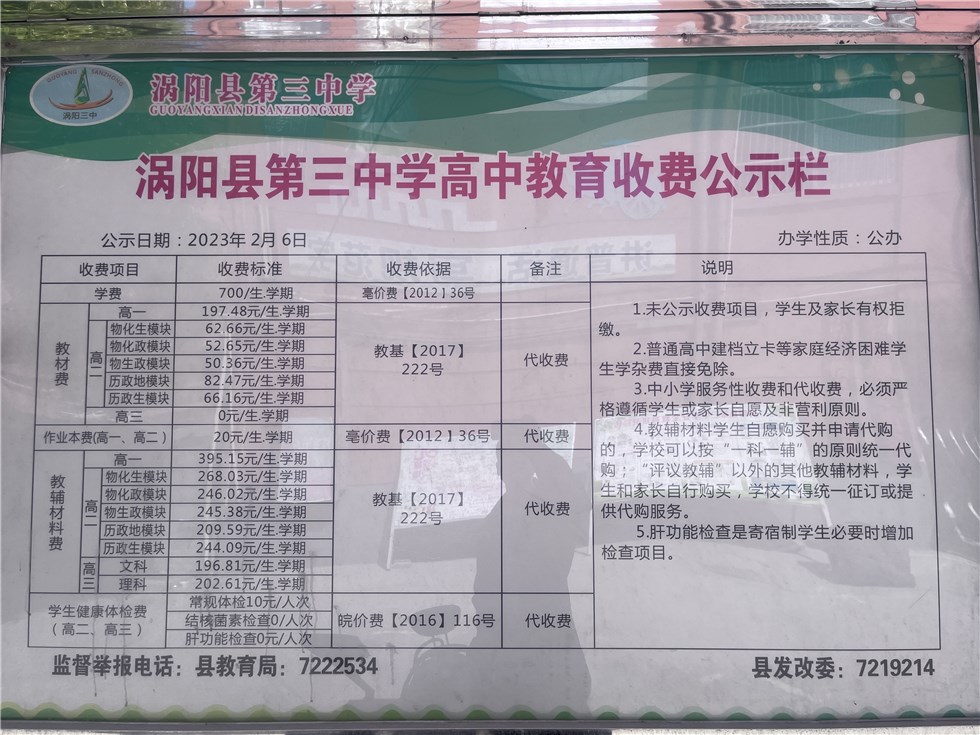 涡阳三中高中部2023年春季收费公示