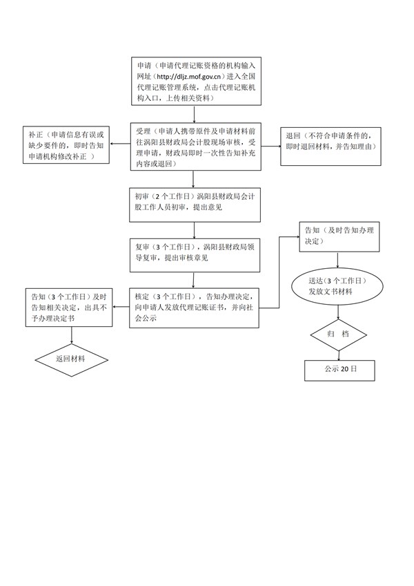 2.携带原件及申请材料前往涡阳县财政局会计股现场核实,告知申请机构修改补正或退回。