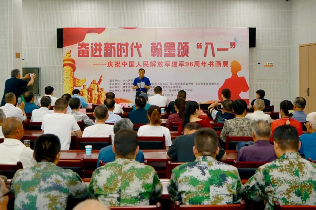 “奋进新时代 翰墨颂‘八一’” 8月1日 ,我县在文化艺术中心举行庆祝中国人民解放军建军96周年书画展,县委常委、宣传部长郑勤主持开幕式。
