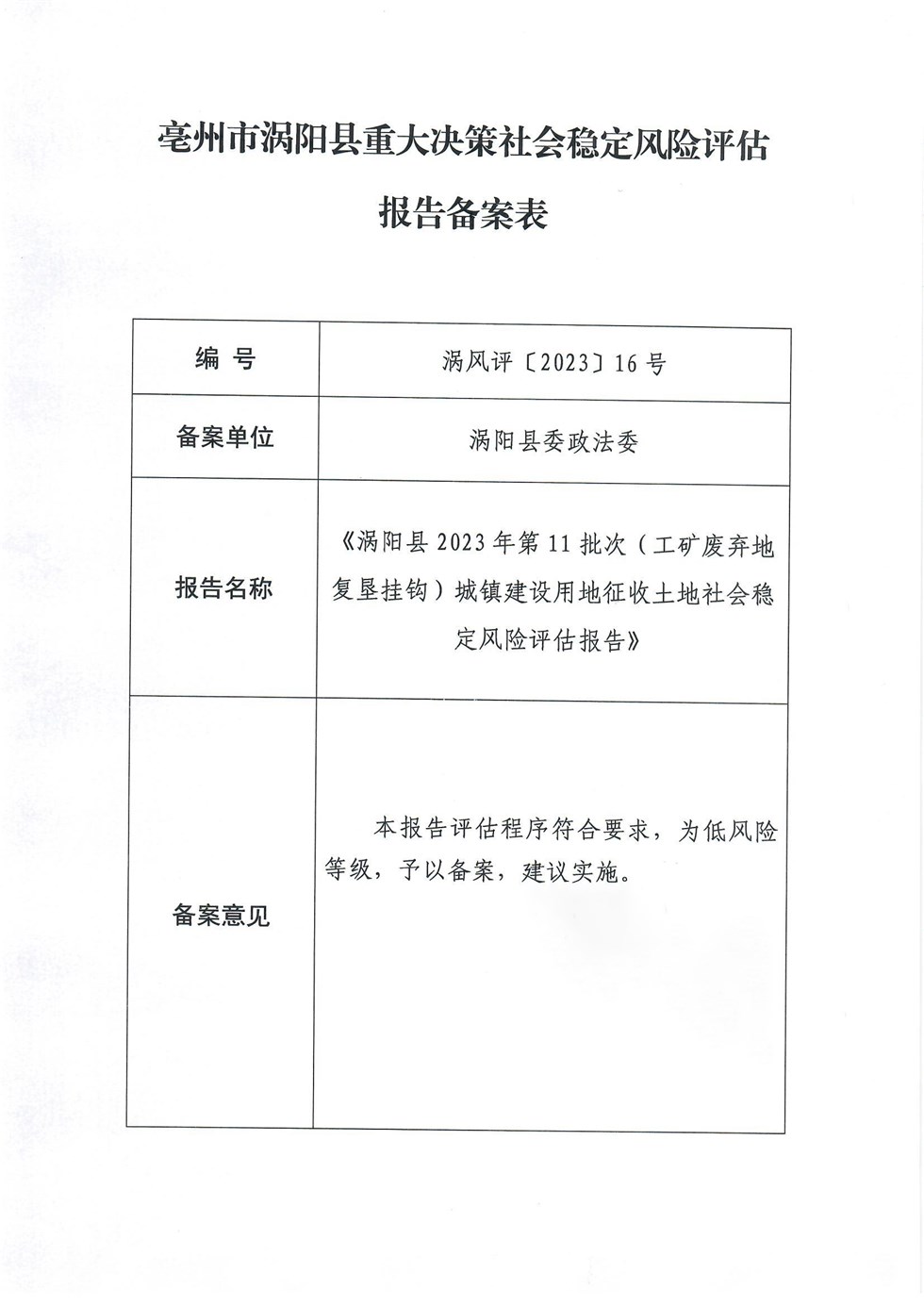 涡阳县2023年第11批次(工矿废弃地复垦挂钩)城镇建设用地征收土地社会稳定风险评估报告