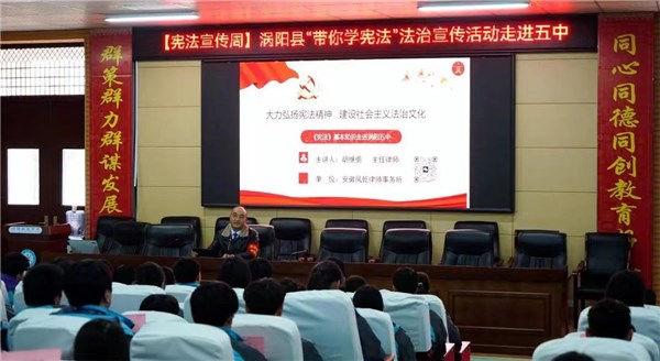 为开展好宪法宣传周活动,增强青少年的宪法意识和法治观念,县司法局组织司法行政干警、“八五”普法讲师团讲师、普法志愿者在涡阳县第五中学为师生们开展了一堂以“大力弘扬宪法精神,建设社会主义法治文化”为主题的法治课。