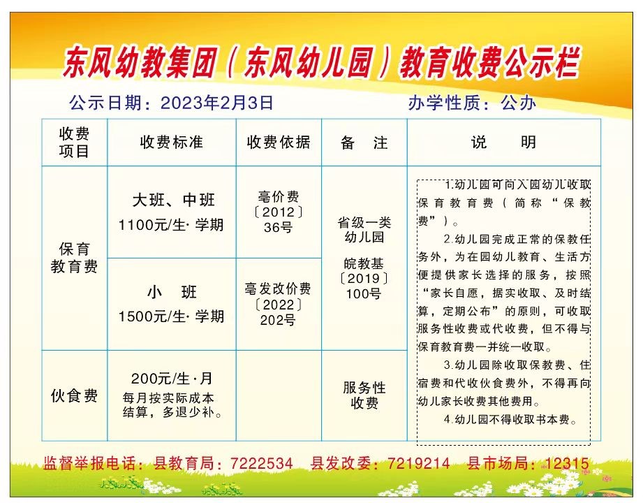 涡阳县东风幼儿园收费项目、收费标准、收费依据公示
