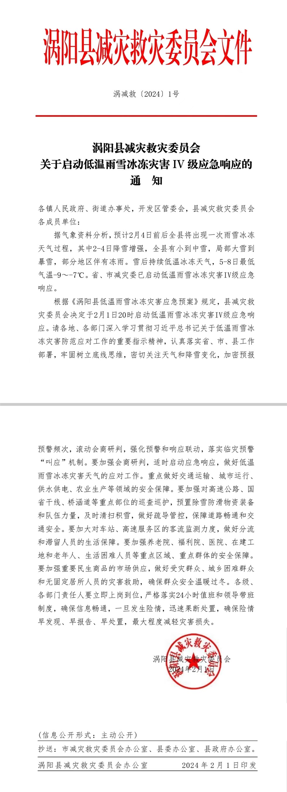 关于启动低温雨雪冰冻灾害IV级应急响应的通知