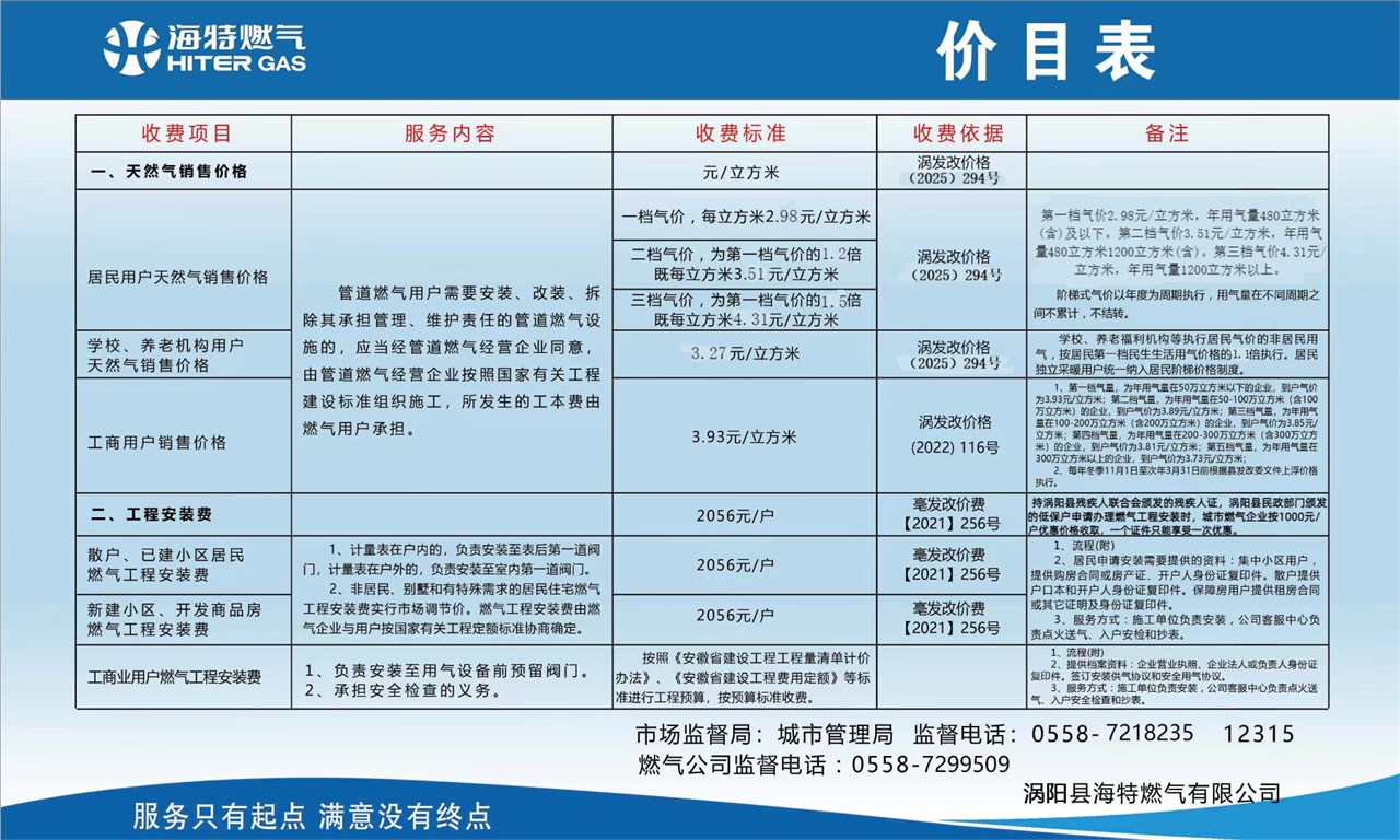 涡阳县海特燃气有限公司燃气销售价格以及收费依据