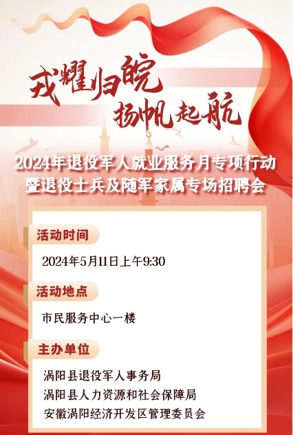 为促进涡阳县退役军人实现高质量就业创业,涡阳县人社局、涡阳县退役军人事务局、安徽涡阳经开区管委会计划于5月11日(本周六)上午9:30在市民服务中心一楼举办“2024年退役军人就业服务月专项行动暨退役士兵及随军家属专场招聘会”。
