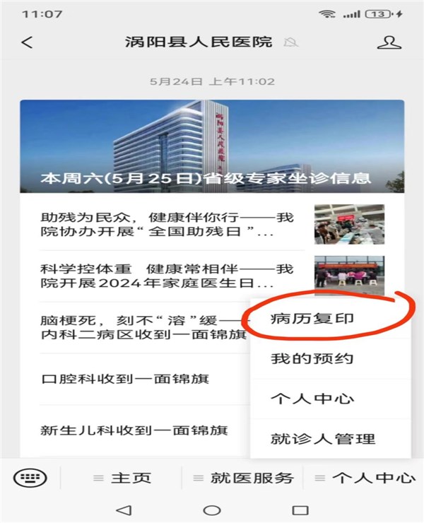 下一条:互联网医疗服务项目及流程病历复印 先关注涡阳县人民医院公众号,打开公众号--点个人中心--病历复印