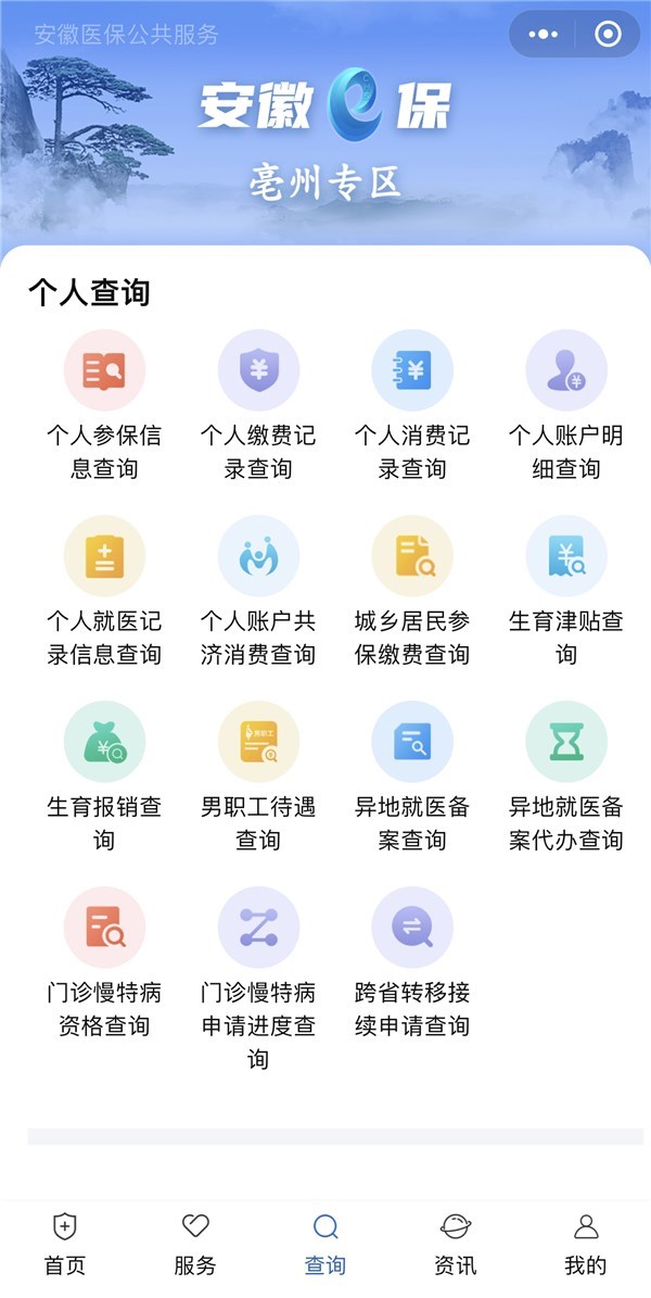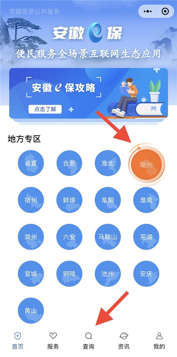 第一步:登录皖事通或支付宝或微信app,搜索“安徽医保公共服务”平台,进入后选择“亳州”专区,点击“查询”按钮。