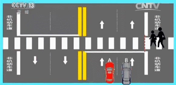 1.行人在道路右幅人行横道行走、未抵达道路中心线时,在左幅道路行驶的机动车A、B应当减速行驶,可在确保安全的前提下通过人行横道。
