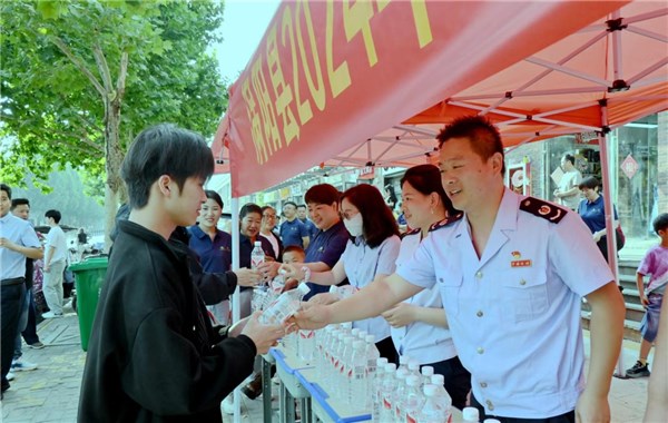 2024年高考进行之际,涡阳县税务局团委积极组织税务青年参与团县委的2024年高考志愿服务活动。在6月7日早上7点之前,税务青年志愿者们就到达了考点,与涡阳县互联网协会的志愿者一道搬运矿泉水、休息凳,为服务活动做好了准备,展现出税务青年积极奉献爱心、服务社会的精神风貌。税务青年志愿者们为考生和家长送上清凉,也祝愿高考学子们都能金榜题名、实现梦想!