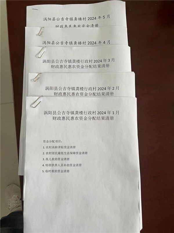 涡阳县公吉寺镇龚楼村2024年1-5月份财政惠民惠农补贴公示资料留存