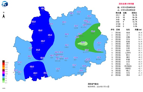 昨天白天至今日傍晚我县普降大到暴雨,截至今日20时大部分地区累计雨量25-50毫米,局部50-61毫米,最大临湖60.8毫米(具体雨量见下图)。