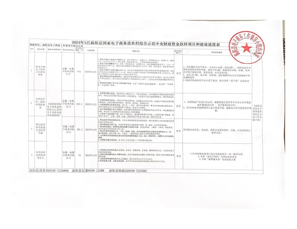 2024年3月涡阳县国家电子商务进农村综合示范中央财政资金扶持项目和建设进度表