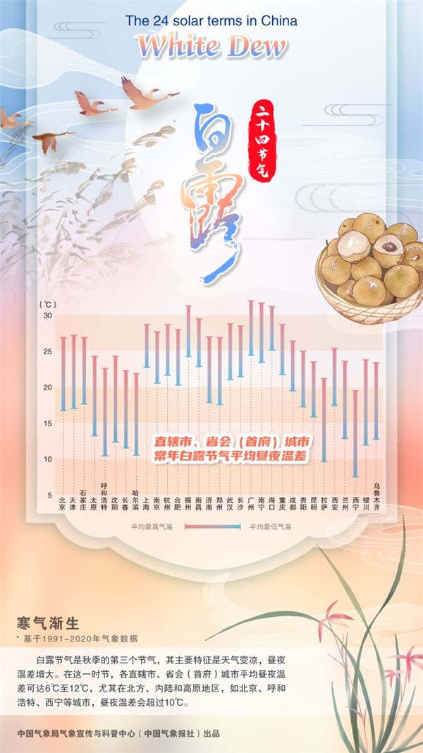 据《月令七十二候集解》对“白露”的诠释——“水土湿气凝而为露,秋属金,金色白,白者露之色,而气始寒也”。此日开始,冷空气“转守为攻”,白昼尚热,但傍晚后气温很快下降,昼夜温差逐渐拉大。