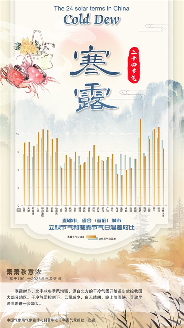 寒露是秋中之秋,天气变化节奏快。就全国平均而言,寒露是二十四节气中降水减少速率最快,也是平均气温下降幅度最大的节气。