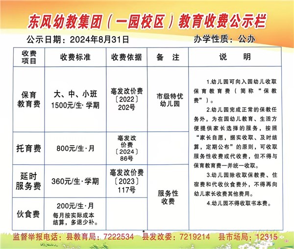 涡阳县东风幼儿园2024年秋季收费公示