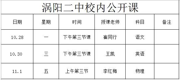 涡阳二中校内公开课安排(2024.10.28-2024.11.2)