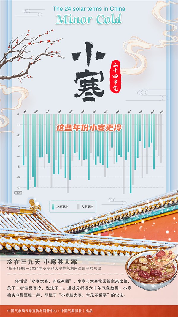 俗话说“小寒大寒,冻成冰团”,作为一年之中的寒冷时节,小寒大寒也常常被拿来比较,关于谁最冷,古今说法不一。 古人说,“寒气之逆极,故谓大寒”,似乎大寒更寒一点。但又说“冷在三九”,小寒恰巧就处于三九天。一个“寒气之逆极”,一个“冷在三九”,看上去这两个节气都是“冷王”。那么到底谁更冷呢?借助现代科技手段,如今,小寒和大寒之争已由靠谱的数据决出了胜负--通过分析我国1991年至2020年各节气期间的平均气温得出,小寒是二十四节气中全国平均气温最低的节气,仅-5.1℃;其次是大寒节气,达-4.5℃。由此可见,我国大部分地区的小寒确实冷得更胜一筹,所谓“小寒胜大寒,常见不稀罕”。