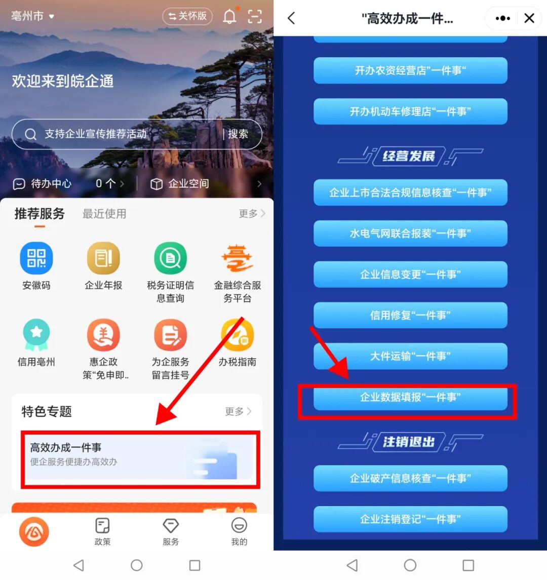 2、左上角城市选择“亳州市”,在首页“特色专题”下点击“高效办成一件事”,在法人事项中找到“企业数据填报一件事”,点击进入。