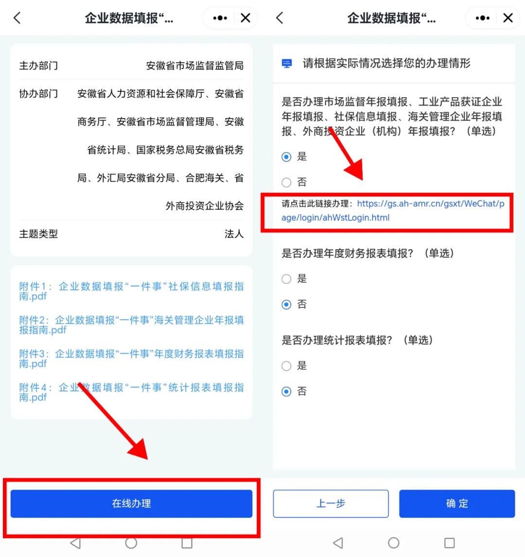 3、阅读办理详情页后点击【在线办理】按钮进入“情形引导”页面,根据自身情况进行情形选择。本文以企业市场监管年报填报为例解读,点击下方链接直接跳转至数据填报页面。