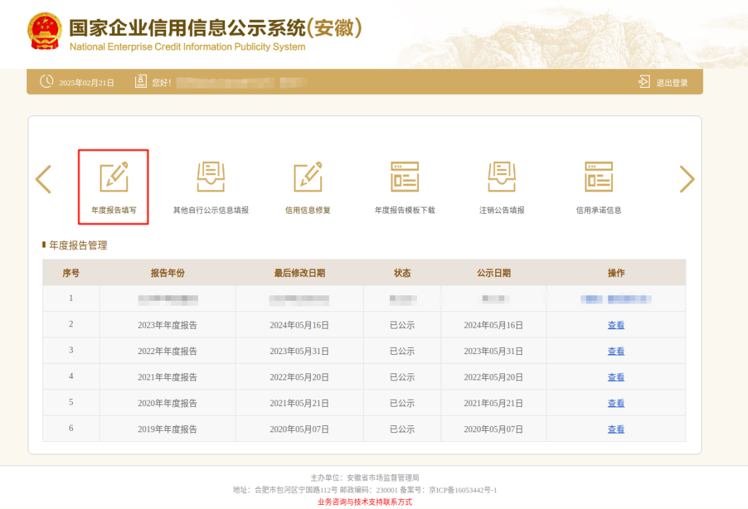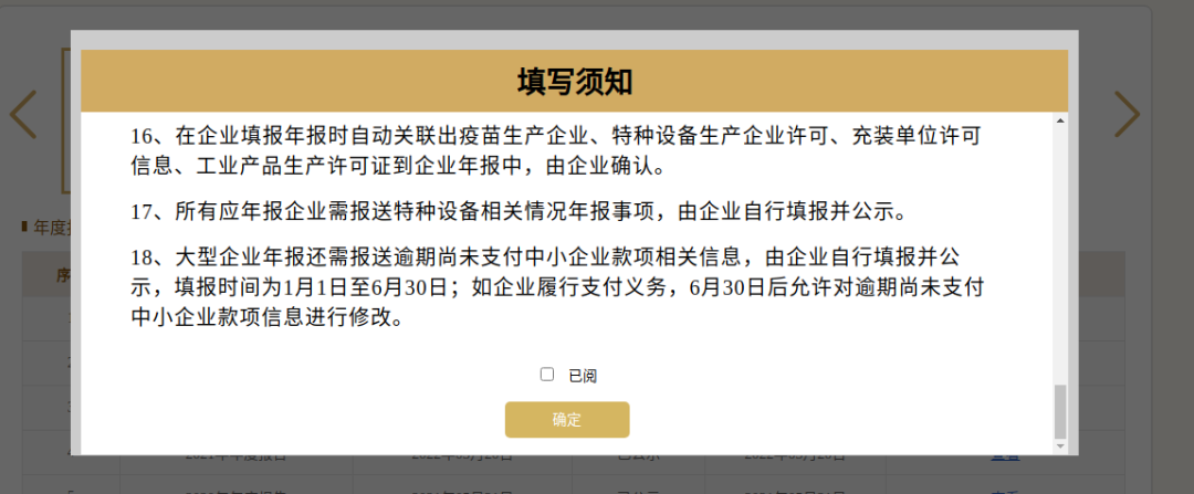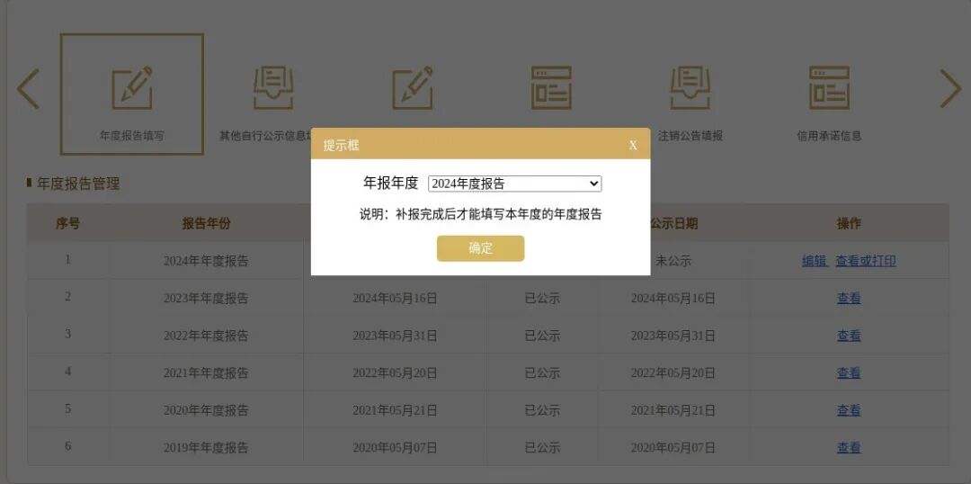 3、进入“年度报告管理”页面,可以查看历年“已公示”或“已修改待公示”年报。点击“年度报告填写”,选择相应年度,阅读并勾选“填写须知”,点击【确定】按钮进入申报界面。