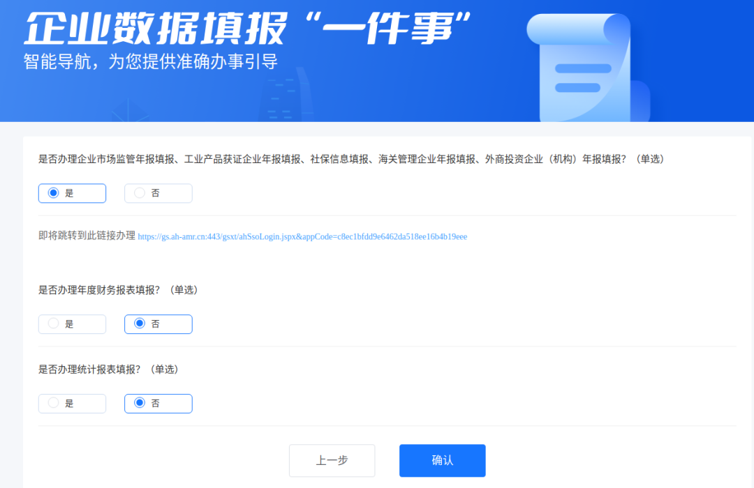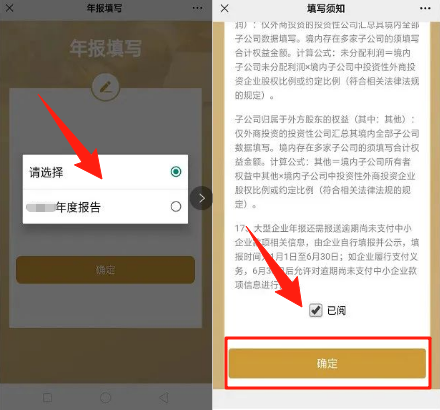 2、根据实际办理需求选择对应的选项,本文以企业市场监管年报填报为例解读,点击【确认】按钮。