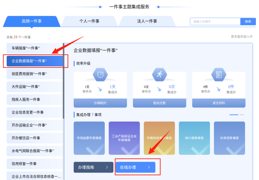 1、使用法人账号登录安徽政务服务网亳州分厅,点击“高效办成一件事”,搜索“企业数据填报一件事”,点击“在线办理”。