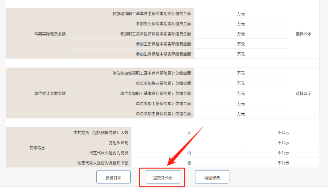 5、系统会自动查询并填入企业的基本信息,企业仅需按步骤逐一填写空白信息并保存,全部填写完毕,进入“预览并公示”页面,通过预览无问题后,点击【提交并公示】按钮,完成申报即可。