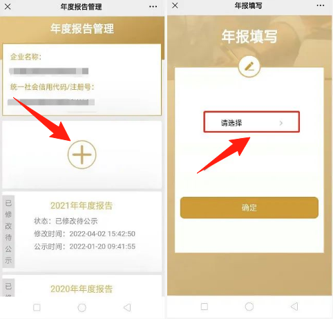 4、进入“年度报告管理”页面,可以查看历年“已公示”或“已修改待公示”年报。点击“+”新增年报填写,选择相应年度,阅读并勾选“填写须知”,点击【确定】按钮进入申报界面。