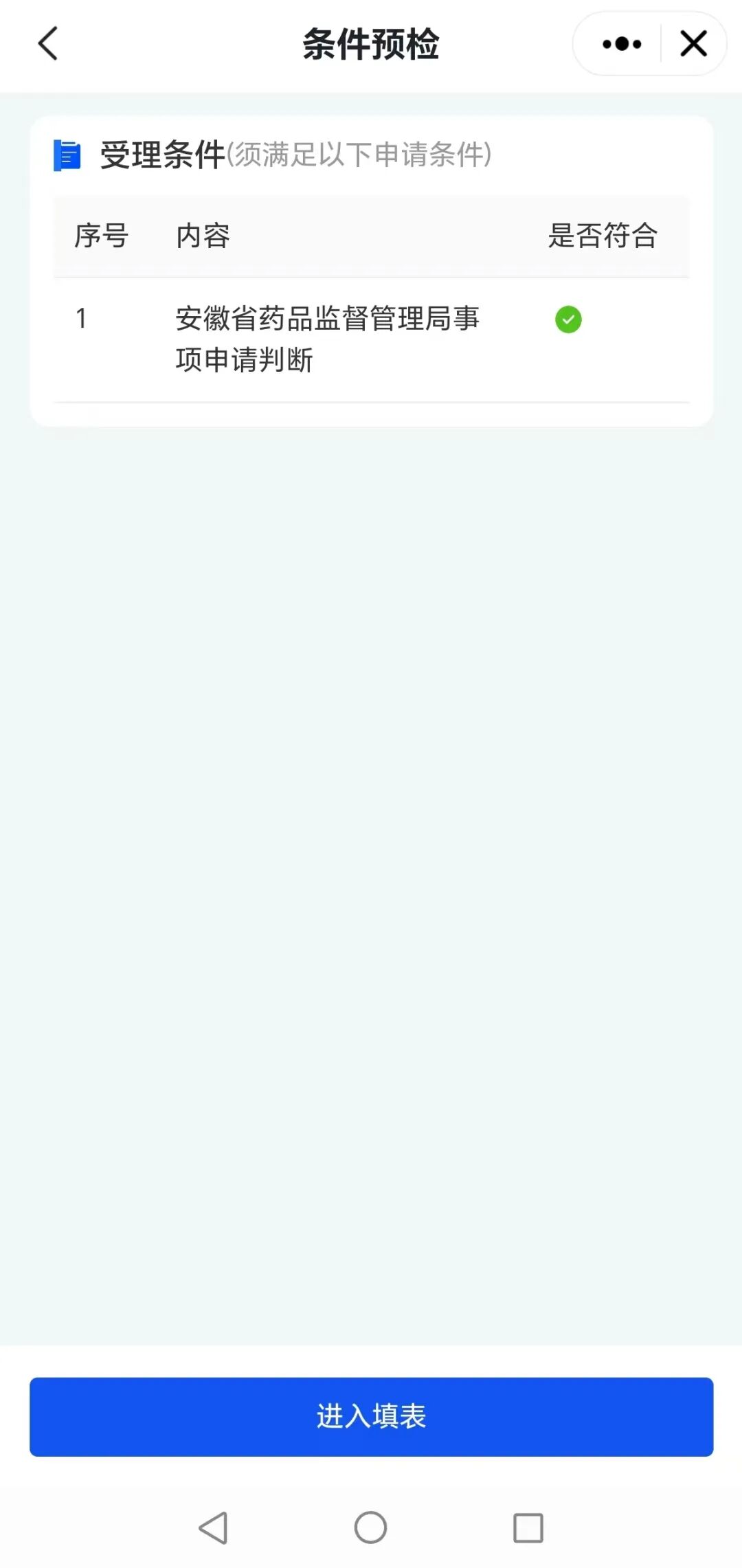 5、进入“条件预检”页面,系统自动对申请企业是否属于核查对象进行预检,不符合办理条件的,则无法继续办理;符合条件的企业,点击【进入填表】按钮,进入填写表单页面。