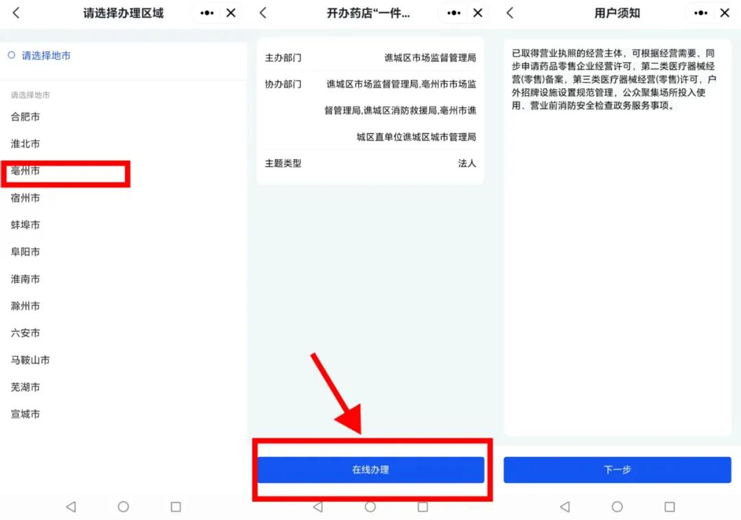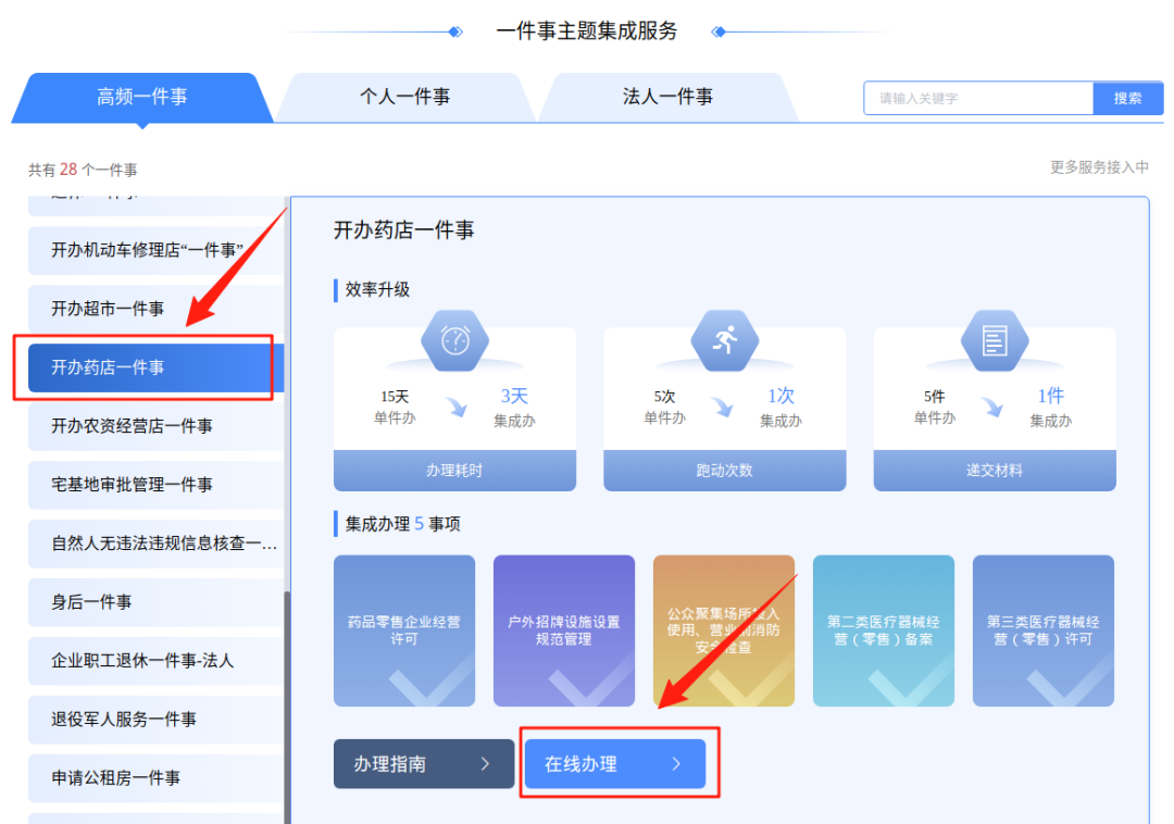 1、使用法人账号登录安徽政务服务网亳州分厅,点击“高效办成一件事”,搜索“开办药店一件事”,点击“在线办理”并选择办理区域。