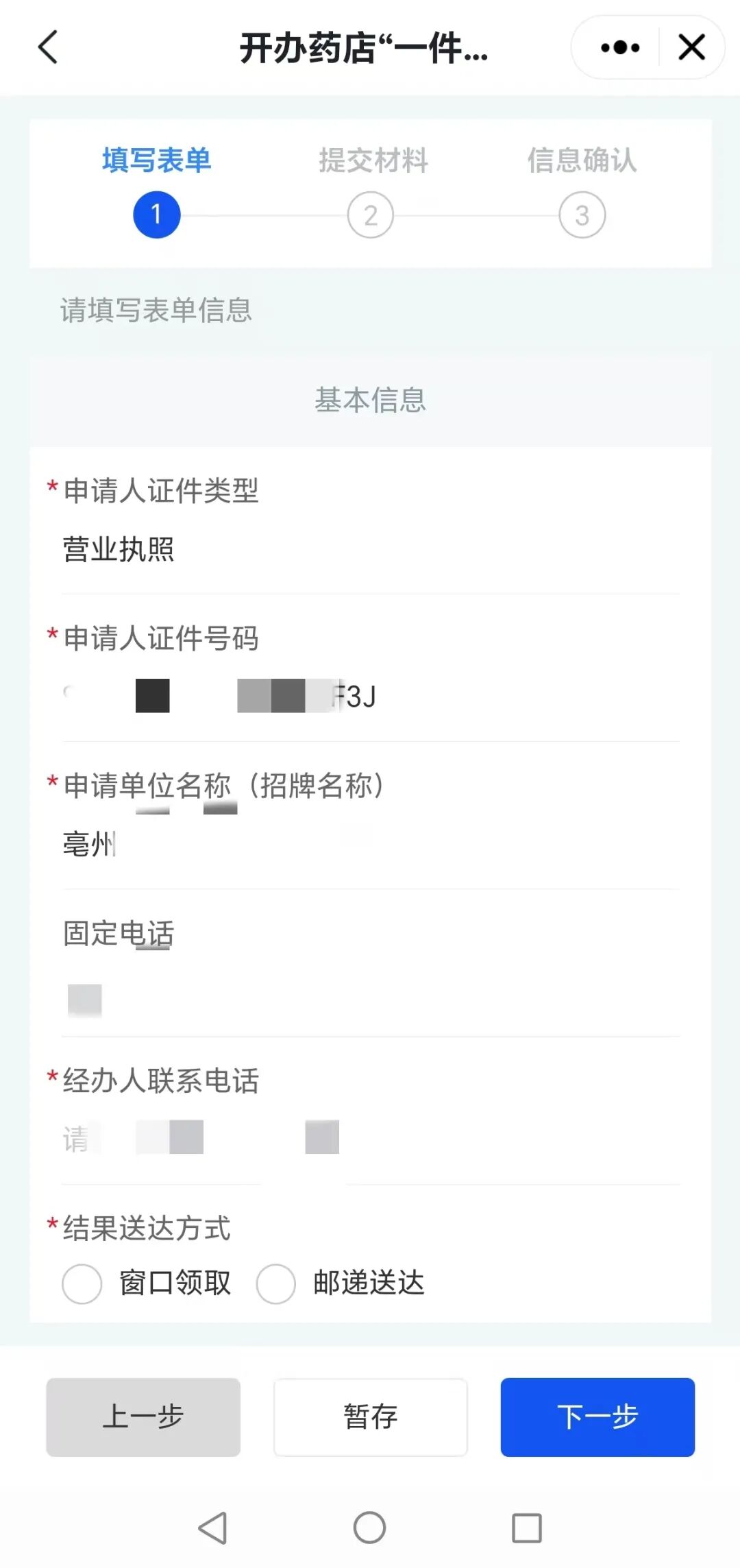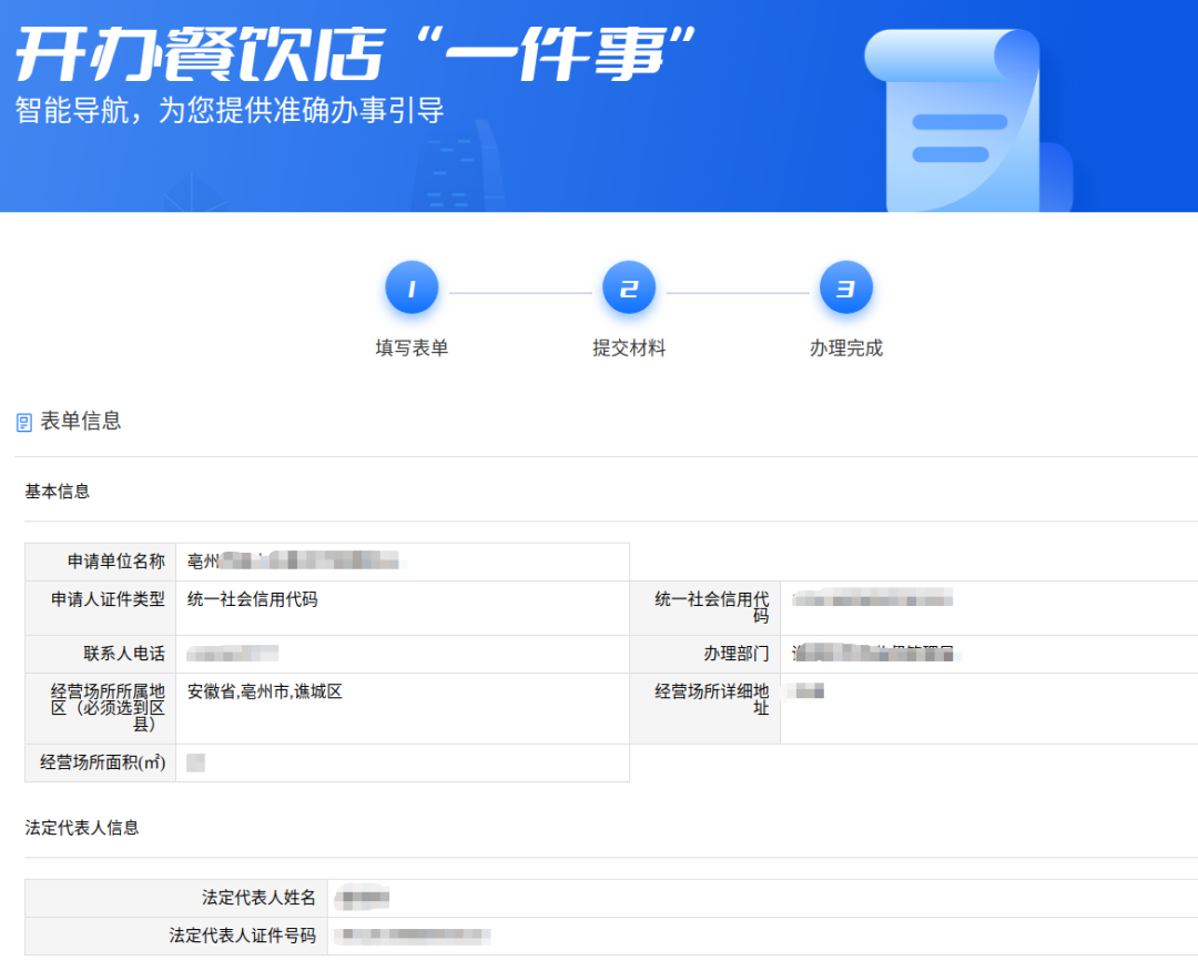6、进入填写表单页面,根据页面提示补充填写企业相关的信息。填写完成之后,点击【下一步】按钮进入提交材料页面。